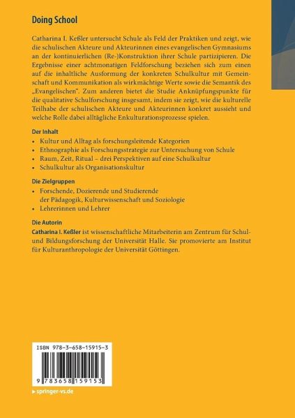 Catharina I. Keßler untersucht Schule als Feld der Praktiken und zeigt, wie die schulischen Akteure und Akteurinnen eines evangelischen Gymnasiums an der kontinuierlichen (Re-)Konstruktion ihrer Schule partizipieren. Die Ergebnisse einer achtmonatigen Feldforschung beziehen sich zum einen auf die inhaltliche Ausformung der konkreten Schulkultur mit Gemeinschaft und Kommunikation als wirkmächtige Werte sowie die Semantik des "Evangelischen". Zum anderen bietet die Studie Anknüpfungspunkte für die qualitative Schulforschung insgesamt, indem sie zeigt, wie die kulturelle Teilhabe der schulischen Akteure und Akteurinnen konkret aussieht und welche Rolle dabei alltägliche Enkulturationsprozesse spielen.