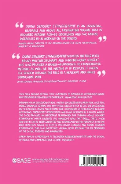 This bold agenda-setting title continues to spearhead interdisciplinary, multisensory research into experience, knowledge and practice. Drawing on an explosion of new, cutting edge research Sarah Pink uses real world examples to bring this innovative area of study to life. She encourages us to challenge, revise and rethink core components of ethnography including interviews, participant observation and doing research in a digital world. The book provides an important framework for thinking about sensory ethnography stressing the numerous ways that smell, taste, touch and vision can be interconnected and interrelated within research. Bursting with practical advice on how to effectively conduct and share sensory ethnography this is an important, original book, relevant to all branches of social sciences and humanities.