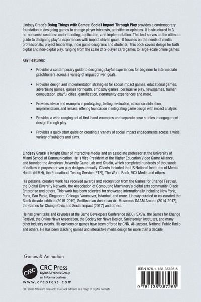 The book provides a contemporary foundation in designing social impact games. It is structured in 3 parts: understanding, application, and implementation. The book serves as a guide to designing social impact games, particularly focused on the needs of, media professionals, indie game designers and college students. It serves as a guide for people looking to create social impact play, informed by heuristics in game design. Key Features Provides contemporary guide on the use of games to create social impact for beginner to intermediate practitioners o Provides design and implementation strategies for social impact games Provides wide ranging case studies in social impact games Provides professional advice from multiple social impact industry practitioners via sidebar interviews, quotes, and postmortems Provides a quick start guide on creating a variety of social impact engagements across a wide variety of subjects and aims