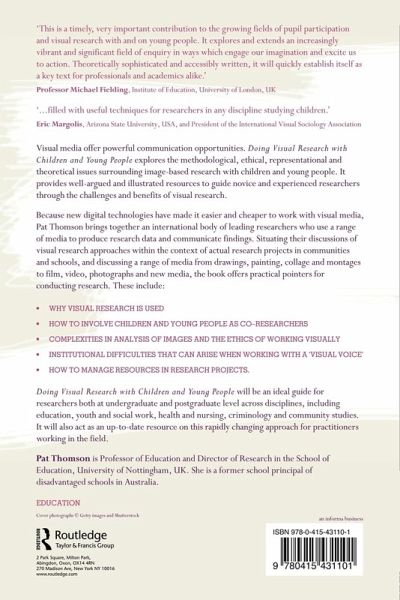 Visual media offer powerful communication opportunities. Doing Visual Research with Children and Young People explores the methodological, ethical, representational and theoretical issues surrounding image-based research with children and young people. It provides well-argued and illustrated resources to guide novice and experienced researchers through the challenges and benefits of visual research.