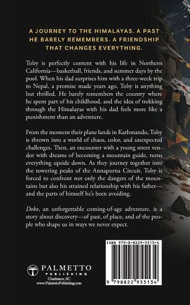 A Journey to the Himalayas. A Past He Barely Remembers. A Friendship That Changes Everything. Toby is perfectly content with his life in Northern California-basketball, friends, and summer days by the pool. But when his dad surprises him with a three-week trip to Nepal, a promise made years ago, Toby is anything but thrilled. He barely remembers the country where he spent part of his childhood, and the idea of trekking through the Himalayas with his dad feels more like a punishment than an adventure. From the moment their plane lands in Kathmandu, Toby is thrown into a world of chaos, color, and unexpected challenges. Then, an encounter with Pratik, a young street vendor with dreams of becoming a mountain guide, turns everything upside down. As they journey together into the towering peaks of the Annapurna Circuit, Toby is forced to confront not only the dangers of the mountains but also his strained relationship with his father-and the parts of himself he's been avoiding. In this unforgettable coming-of-age adventure, Doko is a story about discovery-of past, of place, and of the people who shape us in ways we never expect.