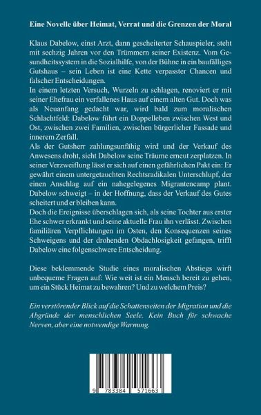Eine Novelle über Heimat, Verrat und die Grenzen der Moral: Klaus Dabelow, einst Arzt, dann gescheiterter Schauspieler, steht mit sechzig Jahren vor den Trümmern seiner Existenz. Vom Gesundheitssystem in die Sozialhilfe, von der Bühne in ein baufälliges Gutshaus - sein Leben ist eine Kette verpasster Chancen und falscher Entscheidungen. In einem letzten Versuch, Wurzeln zu schlagen, renoviert er mit seiner Ehefrau ein verfallenes Haus auf einem alten Gut. Doch was als Neuanfang gedacht war, wird bald zum moralischen Schlachtfeld: Dabelow führt ein Doppelleben zwischen West und Ost, zwischen zwei Familien, zwischen bürgerlicher Fassade und innerem Zerfall. Als der Gutsherr zahlungsunfähig wird und der Verkauf des Anwesens droht, sieht Dabelow seine Träume erneut zerplatzen. In seiner Verzweiflung lässt er sich auf einen gefährlichen Pakt ein: Er gewährt einem untergetauchten Rechtsradikalen Unterschlupf, der einen Anschlag auf ein nahegelegenes Migrantencamp plant. Dabelow schweigt - in der Hoffnung, dass der Verkauf des Gutes scheitert und er bleiben kann. Doch die Ereignisse überschlagen sich, als seine Tochter aus erster Ehe schwer erkrankt und seine aktuelle Frau ihn verlässt. Zwischen familiären Verpflichtungen im Osten, den Konsequenzen seines Schweigens und der drohenden Obdachlosigkeit gefangen, trifft Dabelow eine folgenschwere Entscheidung. Diese beklemmende Studie eines moralischen Abstiegs wirft unbequeme Fragen auf: Wie weit ist ein Mensch bereit zu gehen, um ein Stück Heimat zu bewahren? Und zu welchem Preis? »Ein verstörender Blick auf die Schattenseiten der Migration und die Abgründe der menschlichen Seele. Kein Buch für schwache Nerven, aber eine notwendige Warnung.«