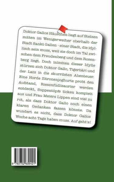 Doktor Gallos Häuschen liegt auf Stelzen mitten im Wenigerweiher oberhalb der Stadt Sankt Gallen - einer Stadt, die idyllisch sein muss, weil sie doch im Tal zwischen dem Freudenberg und dem Rosenberg liegt. Doch inimtten dieser Idylle stürzen sich Doktor Gallo, Tigerbäri und der Latz in die skurrilsten Abenteuer. Eine Horde Zitronenjoghurts probt den Aufstand, Riesenfüdlisaurier werden entdeckt, Suppentöpfe ticken komplett aus und Frau Meiers Lippen sind viel zu rot, als dass Doktor Gallo noch einen klaren Gedanken fassen könnte. Da wundert es nicht, dass Doktor Gallos Woche acht Tage haben muss. Auf geht's!