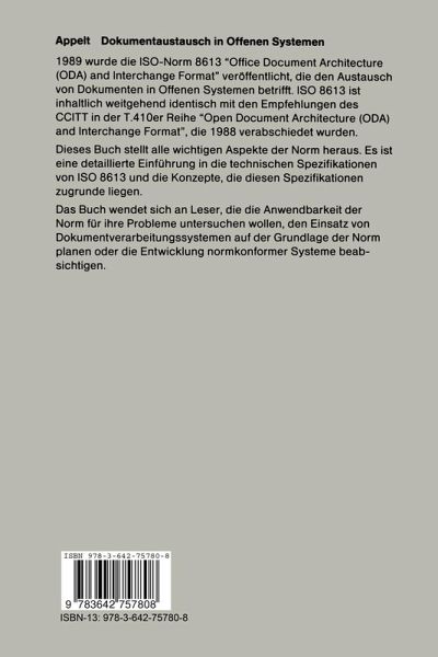 In der Mitte des Jahres 1989 wurde die Internationale Norm" Office Doc ument Architecture (ODA) and Interchange Format" von der ISO (In ternational Organization for Standardization) mit der Registriernummer ISO 8613 veroffentlicht. Eine im wesentlichen inhaltsgleiche Recommen dation des CCITT (Comite Consultatif International Telegraphique et Telephonique) wurde im Herbst 1988 in der-T. 410er Reihe mit dem Titel " Open Document Architecture (ODA) and Interchange Format" verab schiedet. Diese Normen wurden fiir den elektronischen Austausch von Doku menten entwickelt, die in digitaler Form erfaBt sind. Dabei ist vorrangig, aber nicht ausschlieBlich an solche Dokumente gedacht, die iiblicherweise im Biirobereich erstellt werden, etwa Briefe, Vermerke, Berichte, Vertdige oder Rechnungen. E$ solI sichergestellt sein, daB der Empfanger ein sol ches Dokument in der vom Absender beabsichtigten Form auf Papier oder auf einem Bildschirm wiedergeben, aber auch weiterverarbeiten kann, etwa indem er Inhalt oder Aussehen andert. Die Urspriinge von ISO 8613 reichen bis in die friihen achtziger Jahre zuriickj damals begann man, sich mit der Entwicklung von Normen zum Dokumentaustausch zu beschaftigen. Die eigentlichen Vorarbeiten zu ISO 8613 begannen 1982 in der European Computer Manufacturers As sociation (ECMA), von der im Jahre 1985 die ECMA-Norm 101 (" Office Document Architecture ") verabschiedet wurde, die schon die wesentlichen Konzepte von ISO 8613 enthielt. (Inzwischen wurde ECMA 101 wieder an ISO 8613 angeglichen.