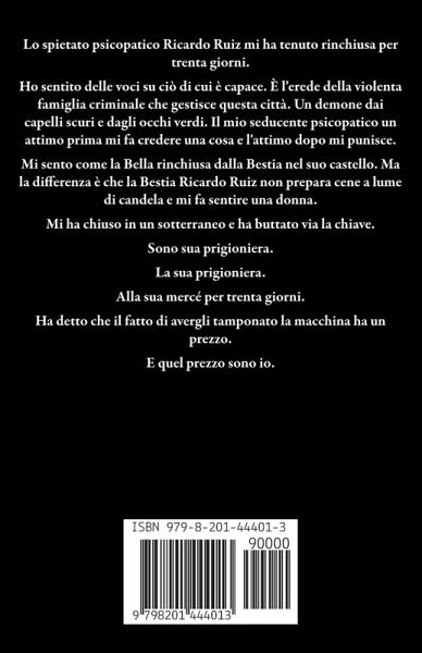 Lo spietato psicopatico Ricardo Ruiz mi ha tenuto rinchiusa per trenta giorni. Ho sentito delle voci su ciò di cui è capace. È l'erede della violenta famiglia criminale che gestisce questa città. Un demone dai capelli scuri e dagli occhi verdi. Il mio seducente psicopatico un attimo prima mi fa credere una cosa e l'attimo dopo mi punisce. Mi sento come la Bella rinchiusa dalla Bestia nel suo castello. Ma la differenza è che la Bestia Ricardo Ruiz non prepara cene a lume di candela e mi fa sentire una donna. Mi ha chiuso in un sotterraneo e ha buttato via la chiave. Sono sua prigioniera. La sua prigioniera. Alla sua mercé per trenta giorni. Ha detto che il fatto di avergli tamponato la macchina ha un prezzo. E quel prezzo sono io.