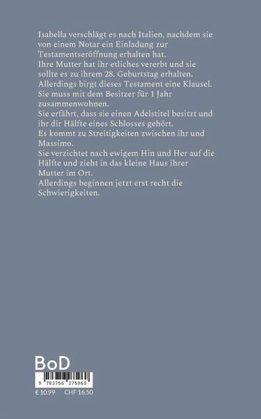 Isabella verschlägt es nach Italien, nachdem sie von einem Notar ein Einladung zur Testamentseröffnung erhalten hat.Ihre Mutter hat ihr etliches vererbt und sie sollte es zu ihrem 28. Geburtstag erhalten.Allerdings birgt dieses Testament eine Klausel.Sie muss mit dem Besitzer für 1 Jahr zusammenwohnen.Sie erfährt, dass sie einen Adelstitel besitzt und ihr dir Hälfte eines Schlosses gehört.Es kommt zu Streitigkeiten zwischen ihr und Massimo.Sie verzichtet nach ewigem Hin und Her auf die Hälfte und zieht in das kleine Haus ihrer Mutter im Ort.Allerdings beginnen jetzt erst recht die Schwierigkeiten.