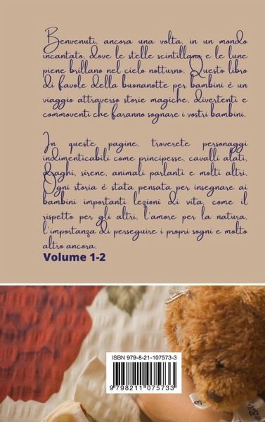Benvenuti in un mondo incantato, dove le stelle scintillano e le lune piene brillano nel cielo notturno. Questo libro di favole della buonanotte per bambini è un viaggio attraverso storie magiche, divertenti e commoventi che faranno sognare i vostri bambini. In queste pagine, troverete personaggi indimenticabili come principesse, cavalli alati, draghi, sirene, animali parlanti e molti altri. Ogni storia è stata pensata per insegnare ai bambini importanti lezioni di vita, come il rispetto per gli altri, l'amore per la natura, l'importanza di perseguire i propri sogni e molto altro ancora. Questo è un bundle del volume 1 e 2.