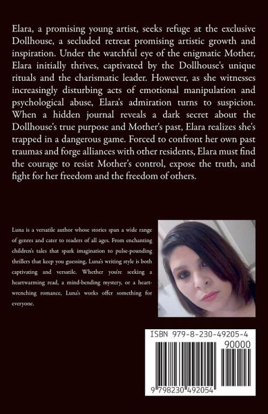 Elara, a promising young artist, seeks refuge at the exclusive Dollhouse, a secluded retreat promising artistic growth and inspiration. Under the watchful eye of the enigmatic Mother, Elara initially thrives, captivated by the Dollhouse's unique rituals and the charismatic leader. However, as she witnesses increasingly disturbing acts of emotional manipulation and psychological abuse, Elara's admiration turns to suspicion. When a hidden journal reveals a dark secret about the Dollhouse's true purpose and Mother's past, Elara realizes she's trapped in a dangerous game. Forced to confront her own past traumas and forge alliances with other residents, Elara must find the courage to resist Mother's control, expose the truth, and fight for her freedom and the freedom of others.