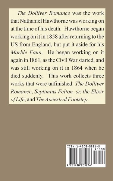 The Dolliver Romance was the work that Nathaniel Hawthorne was working on at the time of his death. Hawthorne began working on it in 1858 after returning to the US from England, but put it aside for his Marble Faun. He began working on it again in 1861, as the Civil War started, and was still working on it in 1864 when he died suddenly. This work collects three works that were unfinished: The Dolliver Romance, Septimus Felton, or, the Elixir of Life, and The Ancestral Footstep.
