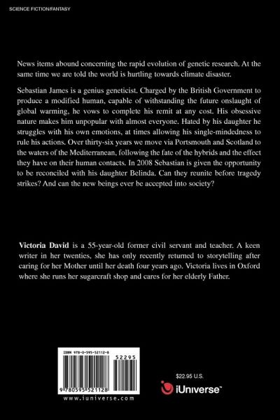 News items abound concerning the rapid evolution of genetic research. At the same time we are told the world is hurtling towards climate disaster. Sebastian James is a genius geneticist. Charged by the British Government to produce a modified human, capable of withstanding the future onslaught of global warming, he vows to complete his remit at any cost. His obsessive nature makes him unpopular with almost everyone. Hated by his daughter he struggles with his own emotions, at times allowing his single-mindedness to rule his actions. Over thirty-six years we move via Portsmouth and Scotland to the waters of the Mediterranean, following the fate of the hybrids and the effect they have on their human contacts. In 2008 Sebastian is given the opportunity to be reconciled with his daughter Belinda. Can they reunite before tragedy strikes? And can the new beings ever be accepted into society?