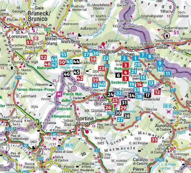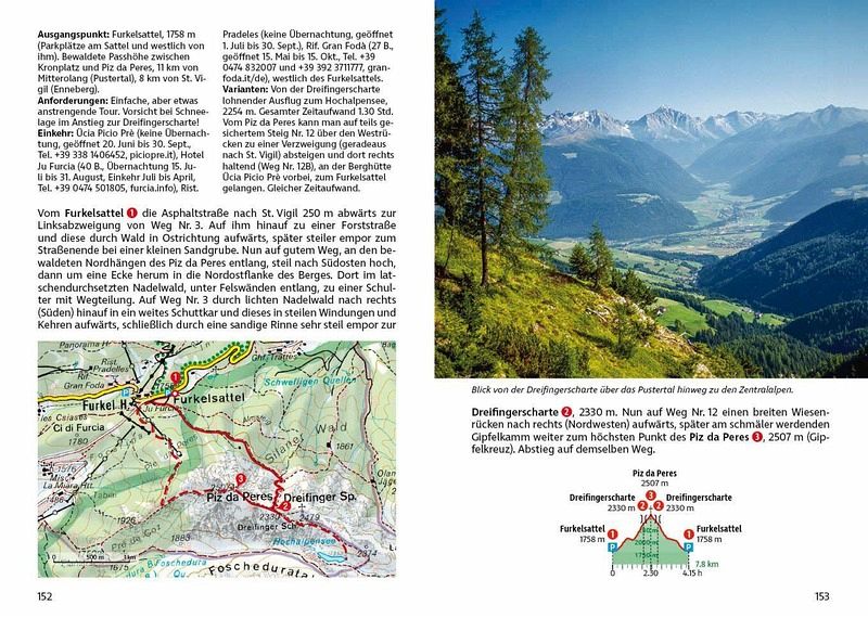 Klassiker wie die Umrundung der Drei Zinnen, Touren zur Auronzohütte, über den Paternsattel oder zum Pragser Wildsee fehlen ebenso wenig wie stille Wege abseits der bekannten Routen. Immer wieder eröffnen sich großartige Ausblicke auf die markanten Felstürme der Drei Zinnen - zu Recht UNESCO-Welterbe.