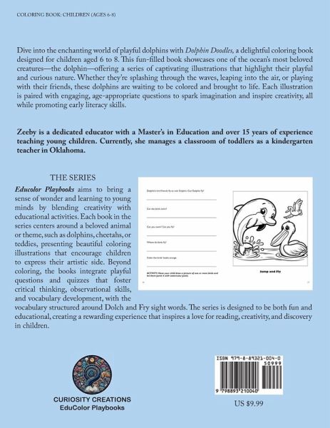 Plunge into the enchanting underwater world with Dolphin Doodles, a captivating coloring book designed for children aged 6 to 8. Each page showcases the playful and intelligent dolphin, one of the ocean's most beloved creatures. The illustrations depict dolphins in various joyful and dynamic scenes - leaping above the waves, playing in the coral reefs, and swimming in pods. These lively images are waiting for young artists to fill them with color, bringing the vibrant world of dolphins to life. But Dolphin Doodles is more than just a coloring book. Accompanying every picture is a series of age-appropriate questions which utilize the frameworks of both Dolch and Fry sight words (additional age-appropriate words may also be used). This further engages the young artists with playful questions related to the coloring picture. Questions like, "What color do you think the bear's hat should be?" or "How many spots can you add to the upside-down bird?" not only inspire creativity in coloring but also promote critical thinking, observation, and writing skills. Dolphin Doodles: The Dolphin Coloring & Quiz Book is an ideal pick for any child fascinated by aquatic wildlife and the wonders of nature. It skillfully combines the excitement of coloring with storytelling and interactive learning, making it a great educational and entertaining choice. This book promises to be a cherished addition to any young explorer's collection, providing hours of creative, informative, and enjoyable activities.