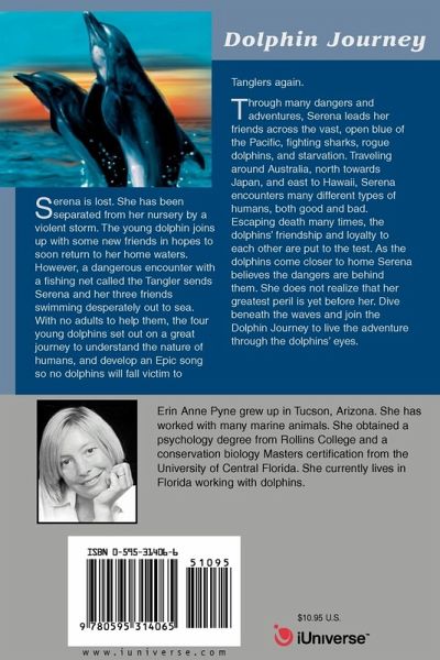 Serena spends her day hunting and playing in the cool waters of the Pacific Ocean. All that ends when she is separated from her nursery by a violent storm. Joining a migration group Serena hopes to soon return to her home waters. However, a dangerous encounter with fishing nets called Tanglers send Serena and her three friends swimming desperately out to sea. With no adults to help them, the four young dolphins set out on a great journey to understand the nature of humanity and develop an Epic song so no dolphins will fall victim to the Tanglers again. Through many dangers and adventures Serena leads her friends across the vast open blue of the Pacific, fighting sharks, other dolphins, and starvation. Traveling around Australia, north towards Japan, and east to Hawaii, Serena encounters many different types of humans, good and bad. Escaping death many times, the dolphins' friendship and loyalty to each other are put to the test. As the dolphins come closer to home Serena believes the dangers are behind them. But she does not realize that her greatest peril is yet before her. Dive beneath the waves and join the Dolphin Journey to live the adventure through a dolphin's eyes.