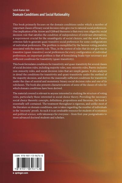 This book primarily focuses on the domain conditions under which a number of important classes of binary social decision rules give rise to rational social preferences. One implication of the Arrow and Gibbard theorems is that every non-oligarchic social decision rule that satisfies the condition of independence of irrelevant alternatives, a requirement crucial for the unambiguity of social choices, and the weak Pareto criterion fails to generate quasi-transitive social preferences for some configurations of individual preferences. The problem is exemplified by the famous voting paradox associated with the majority rule. Thus, in the context of rules that do not give rise to transitive (quasi-transitive) social preferences for every configuration of individual preferences, an important problem is that of formulating Inada-type necessary and sufficient conditions for transitivity (quasi-transitivity).
