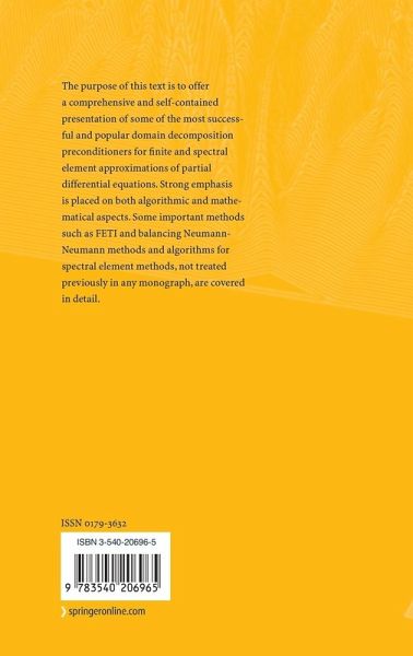 This book offers a comprehensive presentation of some of the most successful and popular domain decomposition preconditioners for finite and spectral element approximations of partial differential equations. It places strong emphasis on both algorithmic and mathematical aspects. It covers in detail important methods such as FETI and balancing Neumann-Neumann methods and algorithms for spectral element methods.