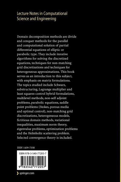 Domain decomposition methods are divide and conquer computational methods for the parallel solution of partial differential equations of elliptic or parabolic type. The methodology includes iterative algorithms, and techniques for non-matching grid discretizations and heterogeneous approximations. This book serves as a matrix oriented introduction to domain decomposition methodology. The topics discussed include hybrid formulations, Schwarz, substructuring and Lagrange multiplier methods for elliptic equations, computational issues, least squares-control methods, multilevel methods, non-self adjoint problems, parabolic equations, saddle point applications (Stokes, porous media and optimal control), non-matching grid discretizations, heterogeneous models, fictitious domain methods, variational inequalities, maximum norm theory, eigenvalue problems, optimization problems and the Helmholtz scattering problem. Selected convergence theory is also included.