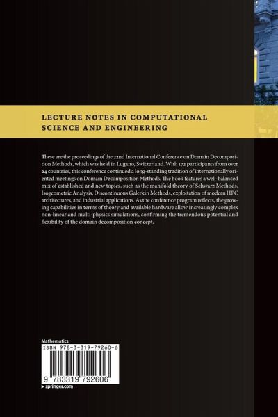 These are the proceedings of the 22nd International Conference on Domain Decomposition Methods, which was held in Lugano, Switzerland. With 172 participants from over 24 countries, this conference continued a long-standing tradition of internationally oriented meetings on Domain Decomposition Methods. The book features a well-balanced mix of established and new topics, such as the manifold theory of Schwarz Methods, Isogeometric Analysis, Discontinuous Galerkin Methods, exploitation of modern HPC architectures and industrial applications. As the conference program reflects, the growing capabilities in terms of theory and available hardware allow increasingly complex non-linear and multi-physics simulations, confirming the tremendous potential and flexibility of the domain decomposition concept.