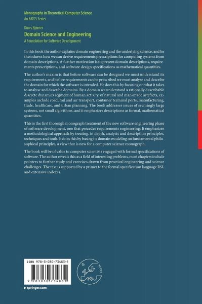 The author's maxim is that before software can be designed we must understand its requirements, and before requirements can be prescribed we must analyse and describe the domain for which the software is intended. He does this by focusing on what it takes to analyse and describe domains. By a domain we understand a rationally describable discrete dynamics segment of human activity, of natural and man-made artefacts, examples include road, rail and air transport, container terminal ports, manufacturing, trade, healthcare, and urban planning. The book addresses issues of seemingly large systems, not small algorithms, and it emphasizes descriptionsas formal, mathematical quantities.