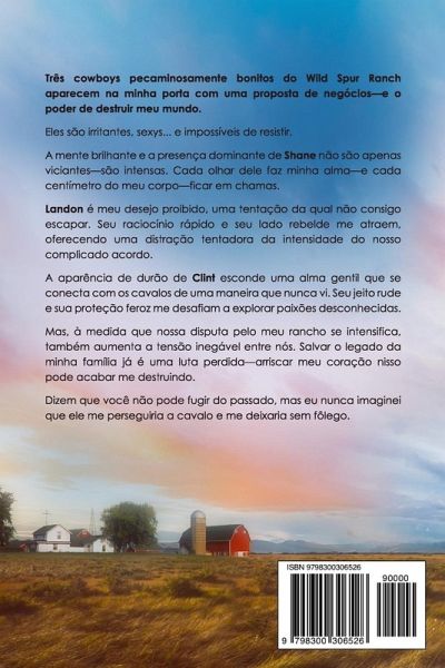 Tres vaqueros pecaminosamente atractivos del Rancho Wild Spur aparecen en la puerta de mi casa con una propuesta de negocios... y el poder de destrozar mi mundo. >La mente brillante y la presencia dominante de Shane no son solo adictivas-me consumen. Cada mirada suya enciende mi alma-y cada centímetro de mi cuerpo-en llamas. Landon es mi deseo prohibido, una tentación de la que no puedo escapar. Su rápido ingenio y su toque rebelde me atraen, ofreciéndome una distracción tentadora de la intensidad de nuestro complicado acuerdo. El exterior rudo de Clint oculta un alma gentil que conecta con los caballos de una manera que nunca había visto. Su carácter brusco y su feroz protección me llevan al límite, desafiándome a explorar pasiones desconocidas. >Dicen que no puedes huir de tu pasado, pero n