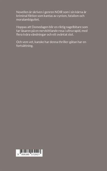Novellen är skriven i genren NOIR som i sin kärna är kriminal fiktion som kantas av cynism, fatalism och moralambiguitet. Hoppas att Domedagen blir en riktig nagelbitare som tar läsaren på en nervkittlande resa i ultra rapid, med flera tvära vändningar och ett oväntat slut. Och vem vet, kanske har denna thriller-gåtan en fortsättning.