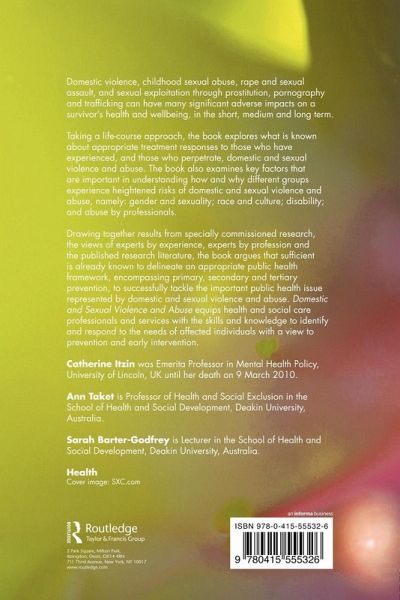 Catherine Itzin was Emerita Professor in Mental Health Policy, University of Lincoln, UK until her death on 9 March 2010. Ann Taket is Professor of Health and Social Exclusion in the School of Health and Social Development, Deakin University, Australia. Sarah Barter-Godfrey is Lecturer in the School of Health and Social Development, Deakin University, Australia.