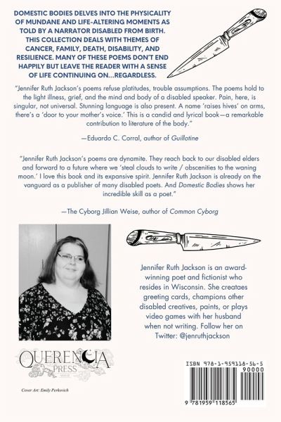Domestic Bodies delves into the physicality of mundane and life-altering moments as told by a narrator disabled from birth. This collection deals with themes of cancer, family, death, disability, and resilience. Many of these poems don't end happily but leave the reader with a sense of life continuing on...regardless.