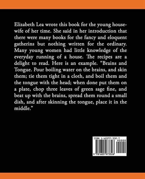 Elizabeth Lea wrote this book for the young housewife of her time. She said in her introduction that there were many books for the fancy and eloquent gatherins but nothing written for the ordinary. Many young women had little knowledge of the everyday running of a house. The recipes are a delight to read. Here is an example. "Brains and Tongue. Pour boiling water on the brains, and skin them; tie them tight in a cloth, and boil them and the tongue with the head; when done put them on a plate, chop three leaves of green sage fine, and beat up with the brains, spread them round a small dish, and after skinning the tongue, place it in the middle."