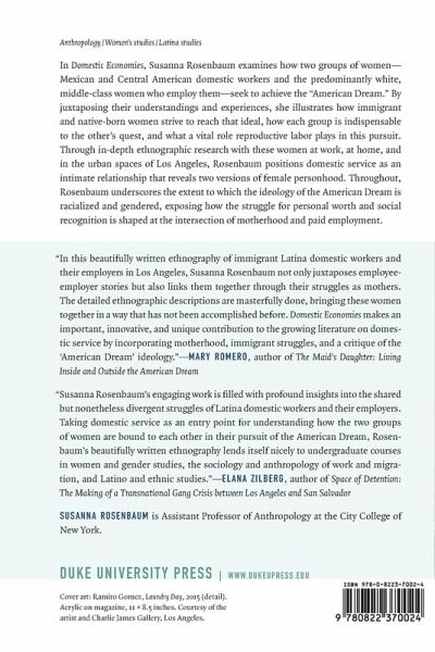 In Domestic Economies, Susanna Rosenbaum examines how two groups of women-Mexican and Central American domestic workers and the predominantly white, middle-class women who employ them-seek to achieve the "American Dream." By juxtaposing their understandings and experiences, she illustrates how immigrant and native-born women strive to reach that ideal, how each group is indispensable to the other's quest, and what a vital role reproductive labor plays in this pursuit. Through in-depth ethnographic research with these women at work, at home, and in the urban spaces of Los Angeles, Rosenbaum positions domestic service as an intimate relationship that reveals two versions of female personhood. Throughout, Rosenbaum underscores the extent to which the ideology of the American Dream is racialized and gendered, exposing how the struggle for personal worth and social recognition is shaped at the intersection of motherhood and paid employment.