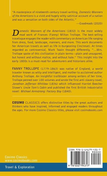 "A masterpiece of nineteenth-century travel-writing, Domestic Manners of the Americans is a vivid and hugely witty satirical account of a nation and was a sensation on both sides of the Atlantic." -Goodreads (2020) Domestic Manners of the Americans (1832) is the most widely read work of Frances (Fanny) Milton Trollope. The best-selling travelogue engages the reader with commentary on American life ranging from dress, food, landscape, manners, and more. This work documents her American travels as well as life in burgeoning Cincinnati. At times regarded as controversial, Mark Twain thought differently, "...Mrs. Trollope spoke of this civilization in plain terms-plain and unsugared, but honest and without malice, and without hate." This insight into the early 1800s is a must-read for adventurers and historians alike.