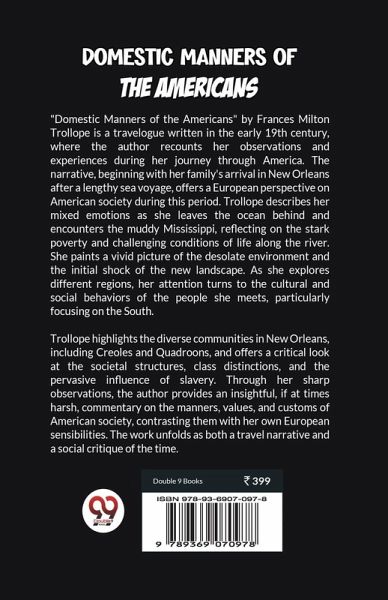 "Domestic Manners of the Americans" by Frances Milton Trollope is a travelogue written in the early 19th century, where the author recounts her observations and experiences during her journey through America. The narrative, beginning with her family's arrival in New Orleans after a lengthy sea voyage, offers a European perspective on American society during this period. Trollope describes her mixed emotions as she leaves the ocean behind and encounters the muddy Mississippi, reflecting on the stark poverty and challenging conditions of life along the river. She paints a vivid picture of the desolate environment and the initial shock of the new landscape. As she explores different regions, her attention turns to the cultural and social behaviors of the people she meets, particularly focusing on the South. Trollope highlights the diverse communities in New Orleans, including Creoles and Quadroons, and offers a critical look at the societal structures, class distinctions, and the pervasive influence of slavery. Through her sharp observations, the author provides an insightful, if at times harsh, commentary on the manners, values, and customs of American society, contrasting them with her own European sensibilities. The work unfolds as both a travel narrative and a social critique of the time.