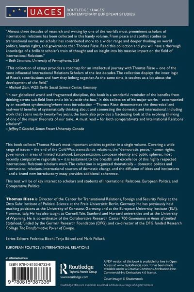 1. Domestic Politics and Norm Diffusion in International Relations: An Intellectual Journey Part I: From the Inside Out: The Domestic Politics of International Relations 2. Public Opinion, Domestic Structure, and Foreign Policy in Liberal Democracies (1991) 2. Democratic Peace - Warlike Democracies? A Social Constructivist Interpretation of the Liberal Argument (1995) 3. Collective Identity in a Democratic Community: The Case of NATO (1996) Part II: From the Outside In: The International Sources of Domestic Change 4. The Socialization of International Human Rights Norms in Domestic Practices: Introduction (with Kathryn Sikkink) (1999) 5. Conceptualizing the Domestic Impact of Europe (with Tanja A. Börzel) (2003) 6. European Institutions and Identity Change: What Have We Learned? (2004) 7. External Actors, State-Building, and Service Provision in Areas of Limited Statehood: Introduction (with Stephen D. Krasner) (2014) Part III: In Between Spaces: Transnational Relations and the Diffusion of Ideas and Institutions 8. Ideas do not float freely: transnational coalitions, domestic structures, and the end of the cold war (1994) 9. Let's Argue! Persuasion and Deliberation in International Relations (2000) 10. From Europeanization to Diffusion. Introduction (with Tanja A. Börzel) (2012)