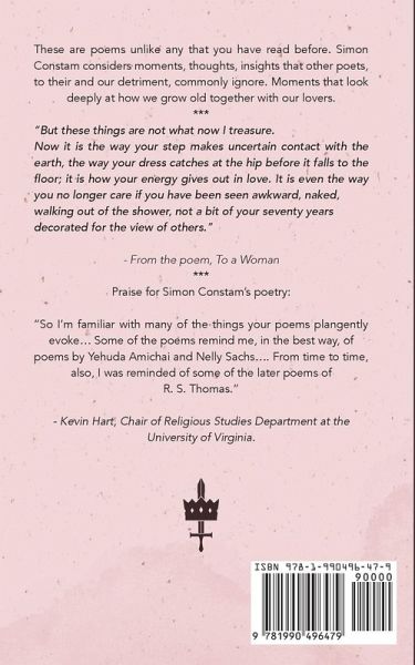 These are poems unlike any that you have read before. Simon Constam considers moments, thoughts, insights that other poets, to their and our detriment, commonly ignore. Moments that look deeply at how we grow old together with our lovers. "But these things are not what now I treasure. Now it is the way your step makes uncertain contact with the earth, the way your dress catches at the hip before it falls to the floor; it is how your energy gives out in love. It is even the way you no longer care if you have been seen awkward, naked, walking out of the shower, not a bit of your seventy years decorated for the view of others." - from the poem, To a Woman Praise for Simon Constam's poetry: "So I'm familiar with many of the things your poems plangently evoke... Some of the poems remind me, in the best way, of poems by Yehuda Amichai and Nelly Sachs.... From time to time, also, I was reminded of some of the later poems of R. S. Thomas." Kevin Hart is a much-honoured poet. He is the Edwin B. Kyle Professor of Christian Studies and Chair of the Religious Studies Department at the University of Virginia.