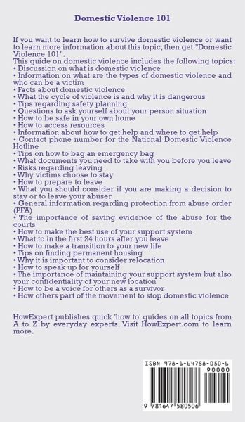 If you want to learn how to survive domestic violence or want to learn more information about this topic, then get "Domestic Violence 101". • This e-book on domestic violence includes the following topics: • Discussion on what is domestic violence • Information on what are the types of domestic violence and who can be a victim HowExpert publishes quick 'how to' guides on all topics from A to Z by everyday experts.