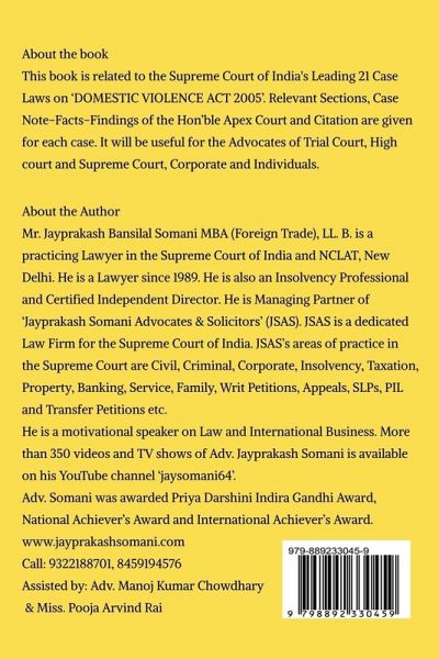 This book is related to the Supreme Court of India's Leading 21 Case Laws on 'DOMESTIC VIOLENCE ACT 2005'. Relevant Sections, Case Note-Facts-Findings of the Hon'ble Apex Court and Citation are given for each case. It will be useful for the Advocates of Trial Court, High court and Supreme Court, Corporate and Individuals.. This book is containing a synopsis of 21 leading causes of the Apex Court. Following points are given for each leading case. 1. Name of the Case i. e. Cause title 2. Relevant Sections discussed in the case 3. Hon'ble Judges/Coram of the case 4. Number of PDF Pages in Original Judgement of the case 5. All available Citations of the case 6. Case Note with appeal allowed/ dismissed or disposed off 7. Facts of the case 8. Hon'ble Apex Court's findings, while dismissing/allowing or disposing off the appeal 9. Ratio Decidendi if any. Author: Jayprakash B. Somani, Advocate Supreme Court of India Assisted by: Adv. Manoj Kumar Chowdhary & Miss. Pooja Arvind Rai