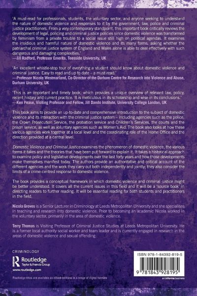 Presents an introduction to the subject of domestic violence and its interaction with the criminal justice system. This book examines the phenomenon of domestic violence and the various forms it takes, and the theories that have been put forward to explain it. It takes an historical approach to examine policy and legislative developments.