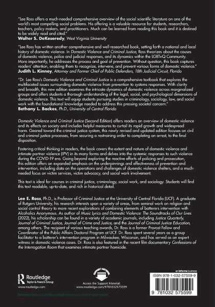 Lee E. Ross, Ph.D., is Professor of Criminal Justice at the University of Central Florida (UCF). A graduate of Rutgers University, his research interests span a variety of areas, from seminal work on religion and social control theory to more recent explorations of combining elements of batterers intervention with Alcoholics Anonymous. As author of Music Lyrics and Domestic Violence: The Soundtracks of Our Lives (2022), his scholarship can be found in a variety of academic journals, including Justice Quarterly , Journal of Criminal Justice, Journal of Crime and Justice, and the Journal of Criminal Justice Education, among others. The recipient of various teaching awards, Dr. Ross is a former Provost Fellow and Coordinator of the Public Affairs Doctoral Program at UCF. Dr. Ross spent several years as a group facilitator to a batterer's intervention program in Milwaukee, Wisconsin, and has served as an expert witness in domestic violence cases. Dr. Ross is also featured in the recent film documentary Confessions of the Interrogation Room that examines intimate partner homicide.