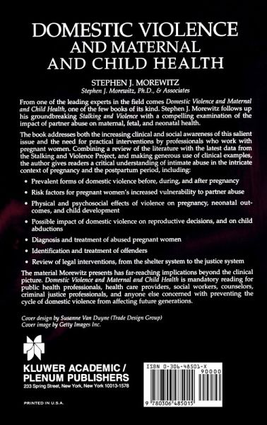 DOMESTIC VIOLENCE AND MATERNAL CHILD HEALTH is one of the first books to evaluate the impact of intimate partner abuse on maternal and child health. New abuse patterns against pregnant women and their unborn babies and children are described based on quantitative and qualitative findings from the Stalking and Violence Project (SVP), case studies from a clinical psychologist's private practice, and a review of the literature. (See Appendix A Research Methods and Appendix B-Study Results, Tables 1-9). Intimate partner abuse is prevalent and can endanger the lives of pregnant women, their fetuses and their children. The long-term societal impacts of violence are significant for the cycle of violence can be transmitted one from generation to the next. Despite the re search studies that have been conducted in this area, little is known about the risk factors for partner abuse and the impact of that abuse on maternal child health and adult health. More research needs to be done about how nurses, physicians, social workers, and therapists can better diagnose and treat partner violence during and after preg nancy. Effective interventions by the police, courts, and legislators also need further investigation. One of the central assumptions in this book is that partner abuse is a patterned set of behaviors developed by the batterer to ex ert power over women in intimate and non-intimate relationships.