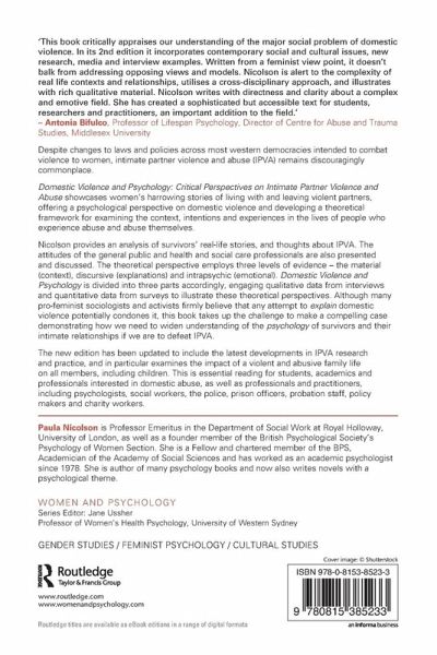 Despite many changes to laws and policies intended to combat violence to women, intimate partner violence and abuse (IPVA) remains discouragingly commonplace.Domestic Violence and Psychology showcases women's harrowing stories of living with and leaving violent partners, offering a psychological perspective on domestic violence.