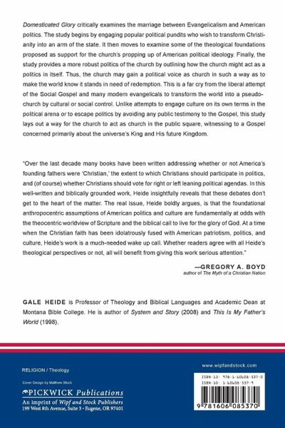 Domesticated Glory critically examines the marriage between Evangelicalism and American politics. The study begins by engaging popular political pundits who wish to transform Christianity into an arm of the state. It then moves to examine some of the theological foundations proposed as support for the church's propping up of American political ideology. Finally, the study provides a more robust politics of the church by outlining how the church might act as a politics in itself. Thus, the church may gain a political voice as church in such a way as to make the world know it stands in need of redemption. This is a far cry from the liberal attempt of the Social Gospel and many modern evangelicals to transform the world into a pseudo-church by cultural or social control. Unlike attempts to engage culture on its own terms in the political arena or to escape politics by avoiding any public testimony to the Gospel, this study lays out a way for the church to act as church in the public square, witnessing to a Gospel concerned primarily about the universe's King and His future Kingdom.