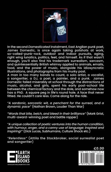 In the second Domesticated instalment, East Anglian punk poet, James Domestic, is once again taking potshots at work, so-called-punk-rock, outdoor and indoor pursuits, aging, right wing lunatics, politics, feet, and himself. As if that wasn't enough, you'll also find his trademark surrealism, sarcasm, and quintessentially British whimsy applied to animals, emails, food, and the power of music, alongside his idiosyncratic illustrations, and photographs from his murky past. A man in too many bands to count, a solo artist, a vocalist, a songwriter, a DJ, a poet, a painter, and a punk. James Domestic failed miserably at school through the distractions of music, alcohol, and girls, spent his early post-school life between the chemical factory and the dole, and somehow now has a PhD. A square peg in life's round hole. A face that never fitted. He couldn't care less. Come along for the ride. "A sardonic, sarcastic wit, a penchant for the surreal, and a dynamic pace" (Nathan Brown, Louder Than War) "Words that bite, belch, and bleed in their brilliance" (Mark Grist, multi-award-winning poet and battle rapper) "A unique collection of poetic ventures into the human condition, with humour, anger, and a canny use of language: inspired and inspiring!" (Dick Lucas, Subhumans, Culture Shock etc.) "Relentless" (Attila the Stockbroker, social surrealist poet and songwriter)