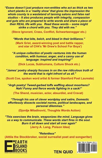 The third and final collection of James Domestic's superb, moving, humorous and insightful street-poetry. "Essex doesn't just produce non-entities who act as thick as two short planks in a 'reality show' that gives the impression the whole county is a wasteland of tanning salons and false nail studios - It also produces people with integrity, compassion and guts who are prepared to write words and share a piece of their REAL life with you. Read these words - some might strike a chord with you. They did with me." (Steve Ignorant, Crass, Conflict, Schwartzeneggar etc.) "Words that bite, belch, and bleed in their brilliance" (Mark Grist, multi-award-winning poet and star of Channel 4's 'Mr Drew's School for Boys') "A unique collection of poetic ventures into the human condition, with humour, anger, and a canny use of language: inspired and inspiring!" (Dick Lucas, Subhumans, Culture Shock etc.) "James' poetry sharply focuses in on the raw ridiculous truth of the world that is right in front of us all." (Scott Coe, spoken word artist & former Stamford Poet Laureate) "Argh poetry! Tweed-garbed toffs waffling about moorhens? Nah! Funny and fierce words fighting in a sack!" (The Shend, musician, actor, absurdist, and Cravat) "Through his use of clever wordplay and satire, Domestic effortlessly dissects societal norms, political landscapes, and personal dilemmas." (Djordje Miladinovic, Thoughts Words Action) "This exercises the brain, weaponizes the mind. Language gives us a way to communicate. These words start fires in the soul. Burn it all down and start all over again" (Jerry A. Lang, Poison Idea) "Relentless" (Attila the Stockbroker, social surrealist poet and songwriter)