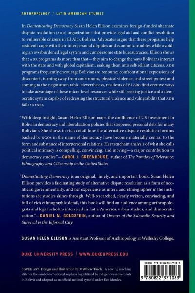 In Domesticating Democracy Susan Helen Ellison examines foreign-funded alternate dispute resolution (ADR) organizations that provide legal aid and conflict resolution to vulnerable citizens in El Alto, Bolivia. Advocates argue that these programs help residents cope with their interpersonal disputes and economic troubles while avoiding an overburdened legal system and cumbersome state bureaucracies. Ellison shows that ADR programs do more than that-they aim to change the ways Bolivians interact with the state and with global capitalism, making them into self-reliant citizens. ADR programs frequently encourage Bolivians to renounce confrontational expressions of discontent, turning away from courtrooms, physical violence, and street protest and coming to the negotiation table. Nevertheless, residents of El Alto find creative ways to take advantage of these micro-level resources while still seeking justice and a democratic system capable of redressing the structural violence and vulnerability that ADR fails to treat.
