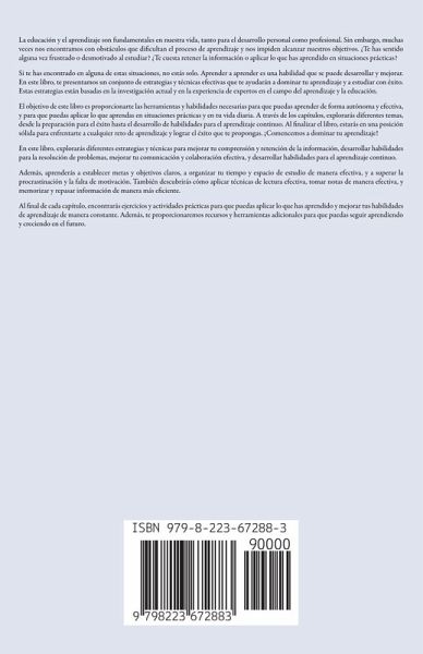 La educación y el aprendizaje son fundamentales en nuestra vida, tanto para el desarrollo personal como profesional. Sin embargo, muchas veces nos encontramos con obstáculos que dificultan el proceso de aprendizaje y nos impiden alcanzar nuestros objetivos. ¿Te has sentido alguna vez frustrado o desmotivado al estudiar? ¿Te cuesta retener la información o aplicar lo que has aprendido en situaciones prácticas? Si te has encontrado en alguna de estas situaciones, no estás solo. Aprender a aprender es una habilidad que se puede desarrollar y mejorar. En este libro, te presentamos un conjunto de estrategias y técnicas efectivas que te ayudarán a dominar tu aprendizaje y a estudiar con éxito. Estas estrategias están basadas en la investigación actual y en la experiencia de expertos en el campo del aprendizaje y la educación. El objetivo de este libro es proporcionarte las herramientas y habilidades necesarias para que puedas aprender de forma autónoma y efectiva, y para que puedas aplicar lo que aprendas en situaciones prácticas y en tu vida diaria. A través de los capítulos, explorarás diferentes temas, desde la preparación para el éxito hasta el desarrollo de habilidades para el aprendizaje continuo. Al finalizar el libro, estarás en una posición sólida para enfrentarte a cualquier reto de aprendizaje y lograr el éxito que te propongas. ¡Comencemos a dominar tu aprendizaje! En este libro, explorarás diferentes estrategias y técnicas para mejorar tu comprensión y retención de la información, desarrollar habilidades para la resolución de problemas, mejorar tu comunicación y colaboración efectiva, y desarrollar habilidades para el aprendizaje continuo. Además, aprenderás a establecer metas y objetivos claros, a organizar tu tiempo y espacio de estudio de manera efectiva, y a superar la procrastinación y la falta de motivación. También descubrirás cómo aplicar técnicas de lectura efectiva, tomar notas de manera efectiva, y memorizar y repasar información de manera más eficiente. Al final de cada capítulo, encontrarás ejercicios y actividades prácticas para que puedas aplicar lo que has aprendido y mejorar tus habilidades de aprendizaje de manera constante. Además, te proporcionaremos recursos y herramientas adicionales para que puedas seguir aprendiendo y creciendo en el futuro.