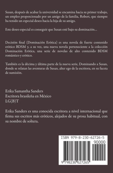Susan, después de acabar la universidad se encamina hacia su primer trabajo, un empleo proporcionado por un amigo de la familia, Robert, que siempre ha tenido un especial deseo hacia la hija de su amigo. Este deseo especial es conseguir que Susan esté bajo su dominación... Decisión final (Dominación Erótica) es una novela de fuerte contenido erótico BDSM y, a su vez, una nueva novela perteneciente a la colección Dominación Erótica, una serie de novelas de alto contenido BDSM romántico y erótico. También es la décima y última parte de la nueva serie, Dominando a Susan, donde se relatan las aventuras de Susan, alter ego de la escritora, en su faceta de sumisión.