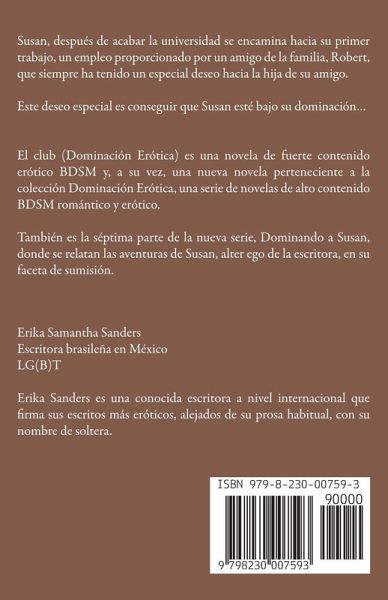 Susan, después de acabar la universidad se encamina hacia su primer trabajo, un empleo proporcionado por un amigo de la familia, Robert, que siempre ha tenido un especial deseo hacia la hija de su amigo. Este deseo especial es conseguir que Susan esté bajo su dominación... El club (Dominación Erótica) es una novela de fuerte contenido erótico BDSM y, a su vez, una nueva novela perteneciente a la colección Dominación Erótica, una serie de novelas de alto contenido BDSM romántico y erótico. También es la séptima parte de la nueva serie, Dominando a Susan, donde se relatan las aventuras de Susan, alter ego de la escritora, en su faceta de sumisión.