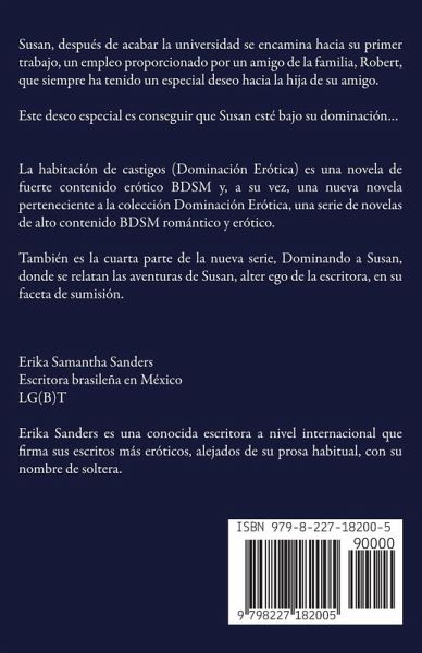 Susan, después de acabar la universidad se encamina hacia su primer trabajo, un empleo proporcionado por un amigo de la familia, Robert, que siempre ha tenido un especial deseo hacia la hija de su amigo. Este deseo especial es conseguir que Susan esté bajo su dominación... La habitación de castigos (Dominación Erótica) es una novela de fuerte contenido erótico BDSM y, a su vez, una nueva novela perteneciente a la colección Dominación Erótica, una serie de novelas de alto contenido BDSM romántico y erótico. También es la cuarta parte de la nueva serie, Dominando a Susan, donde se relatan las aventuras de Susan, alter ego de la escritora, en su faceta de sumisión.