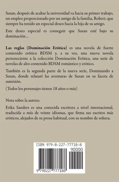Susan, después de acabar la universidad va hacia su primer trabajo, un empleo proporcionado por un amigo de la familia, Robert, que siempre ha tenido un especial deseo hacia la hija de su amigo. Este deseo especial es conseguir que Susan esté bajo su dominación... Las reglas (Dominación Erótica) es una novela de fuerte contenido erótico BDSM y, a su vez, una nueva novela perteneciente a la colección Dominación Erótica, una serie de novelas de alto contenido BDSM romántico y erótico. También es la segunda parte de la nueva serie, Dominando a Susan, donde relataré las aventuras de Susan en su faceta de sumisión. Nota sobre la autora: Erika Sanders es una conocida escritora a nivel internacional que firma sus escritos más eróticos, alejados de su prosa habitual, con su nombre de soltera.