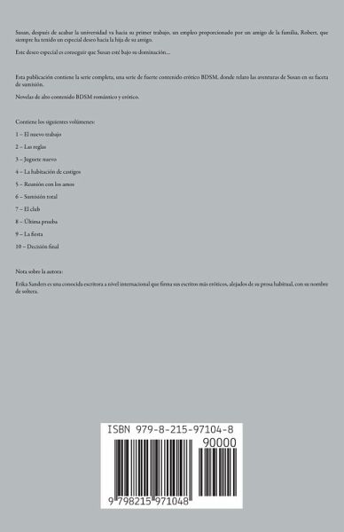 Susan, después de acabar la universidad va hacia su primer trabajo, un empleo proporcionado por un amigo de la familia, Robert, que siempre ha tenido un especial deseo hacia la hija de su amigo. Este deseo especial es conseguir que Susan esté bajo su dominación... Esta publicación contiene la serie completa, una serie de fuerte contenido erótico BDSM, donde relato las aventuras de Susan en su faceta de sumisión. Novelas de alto contenido BDSM romántico y erótico. Contiene los siguientes volúmenes: 1 - El nuevo trabajo 2 - Las reglas 3 - Juguete nuevo 4 - La habitación de castigos 5 - Reunión con los amos 6 - Sumisión total 7 - El club 8 - Última prueba 9 - La fiesta 10 - Decisión final Nota sobre la autora: Erika Sanders es una conocida escritora a nivel internacional que firma sus escritos más eróticos, alejados de su prosa habitual, con su nombre de soltera.