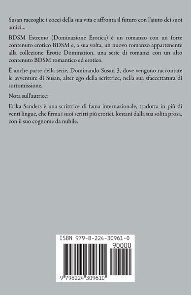 Susan raccoglie i cocci della sua vita e affronta il futuro con l'aiuto dei suoi amici... BDSM Estremo (Dominazione Erotica) è un romanzo con un forte contenuto erotico BDSM e, a sua volta, un nuovo romanzo appartenente alla collezione Erotic Domination, una serie di romanzi con un alto contenuto BDSM romantico ed erotico. È anche parte della serie, Dominando Susan 3, dove vengono raccontate le avventure di Susan, alter ego della scrittrice, nella sua sfaccettatura di sottomissione. Nota sull'autrice: Erika Sanders è una scrittrice di fama internazionale, tradotta in più di venti lingue, che firma i suoi scritti più erotici, lontani dalla sua solita prosa, con il suo cognome da nubile.