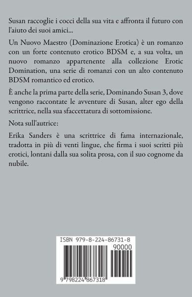 Susan raccoglie i cocci della sua vita e affronta il futuro con l'aiuto dei suoi amici... Un Nuovo Maestro (Dominazione Erotica) è un romanzo con un forte contenuto erotico BDSM e, a sua volta, un nuovo romanzo appartenente alla collezione Erotic Domination, una serie di romanzi con un alto contenuto BDSM romantico ed erotico. È anche la prima parte della serie, Dominando Susan 3, dove vengono raccontate le avventure di Susan, alter ego della scrittrice, nella sua sfaccettatura di sottomissione. Nota sull'autrice: Erika Sanders è una scrittrice di fama internazionale, tradotta in più di venti lingue, che firma i suoi scritti più erotici, lontani dalla sua solita prosa, con il suo cognome da nubile.